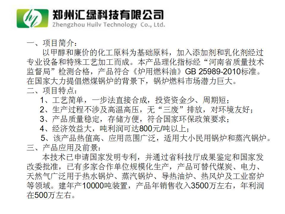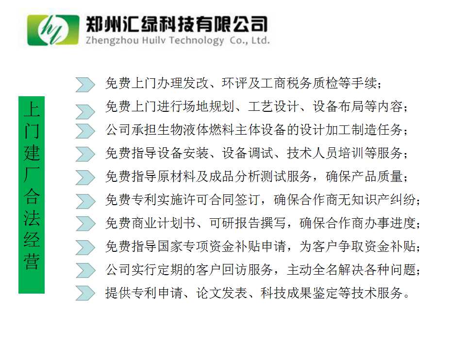 截至目前,鄭州匯綠科技有限公司已發(fā)展成為擁有2項科技成果和20項專(zhuān)利的高科技企業(yè)。公司新能源項目在河南、河北、山東及廣東等地建成工業(yè)化示范工廠(chǎng),并取得了較好的經(jīng)濟效益和社會(huì )效益。鄭州匯綠科技有限公司真誠希望與全國廣大欲致力于能源產(chǎn)業(yè)的投資者以專(zhuān)利使用、合作辦廠(chǎng)、技術(shù)入股、區域代理等形式建立最誠摯的合作關(guān)系,最大限度地達到企業(yè)與投資者的共贏(yíng)!詳詢(xún)請請點(diǎn)擊鄭州匯綠科技官網(wǎng)http://m.usmechanicalrepairinc.com