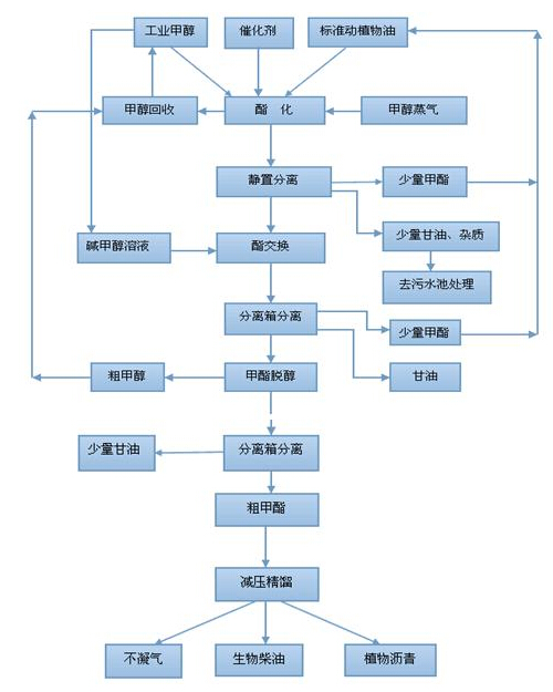 原料泔水油(或地溝油等)→預處理→連續脫水→酯化(酯交換)→脫溶→相分離→水洗調質(zhì)→過(guò)濾→析氣脫水→一次蒸餾→二次蒸餾→冷凝冷卻→精過(guò)濾→生物柴油